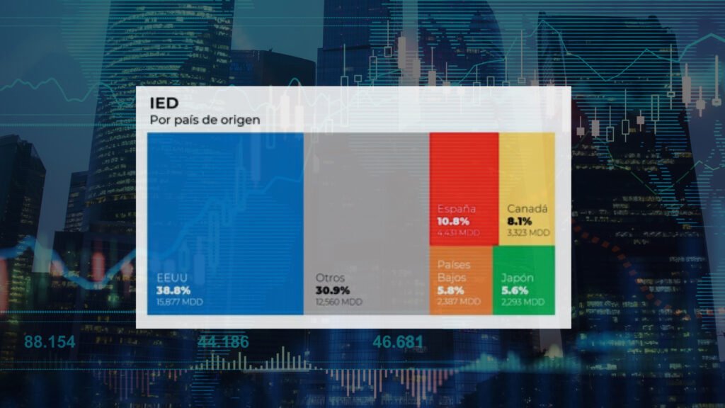 De acuerdo con cifras oficiales de la Secretaría de Economía, Estados Unidos se mantuvo como el principal inversionista, con 15,877 millones de dólares, equivalentes al 38.8% del total. Le siguieron España, con 4,431 millones de dólares (10.8%); Canadá, con 3,323 millones (8.1%); Países Bajos, con 2,387 millones (5.8%); y Japón, con 2,293 millones de dólares (5.6%).