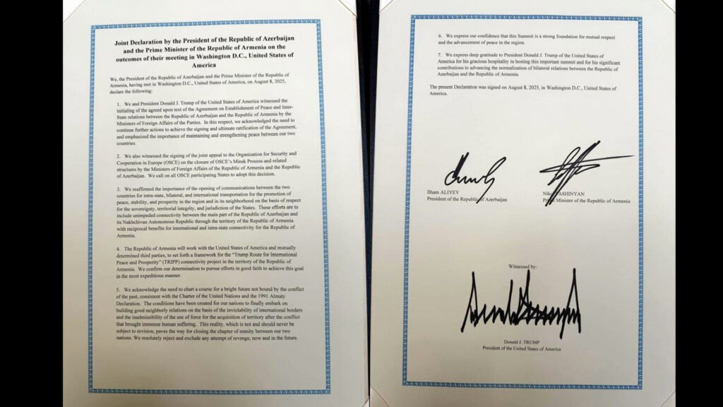 En un acto que la Casa Blanca calificó como “histórico”, Azerbaiyán y Armenia pusieron fin a casi cuatro décadas de hostilidades con la firma de una declaración conjunta en Washington, el pasado 8 de agosto de 2025. El encuentro, presidido por el mandatario estadounidense Donald Trump, reunió al presidente azerbaiyano, Ilham Aliyev, y al primer ministro armenio, Nikol Pashinyan, quienes sellaron un compromiso que busca cimentar la paz y la estabilidad duraderas en el Cáucaso del Sur.